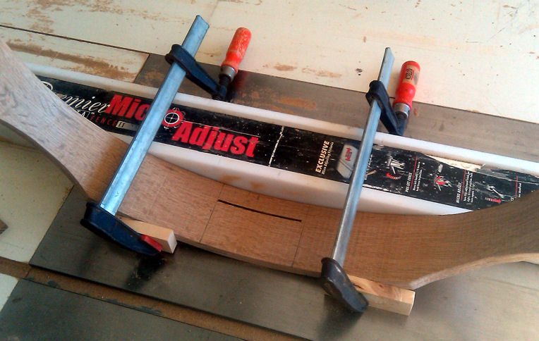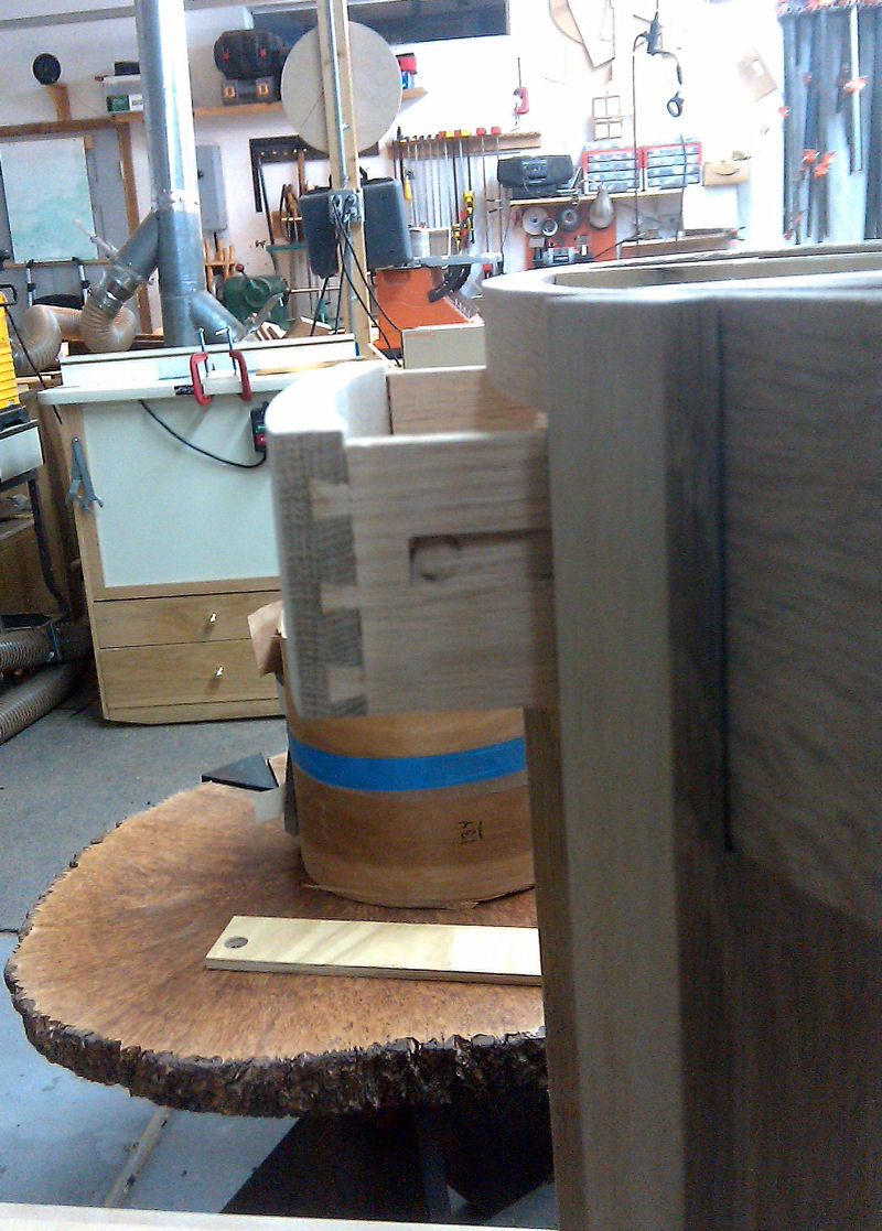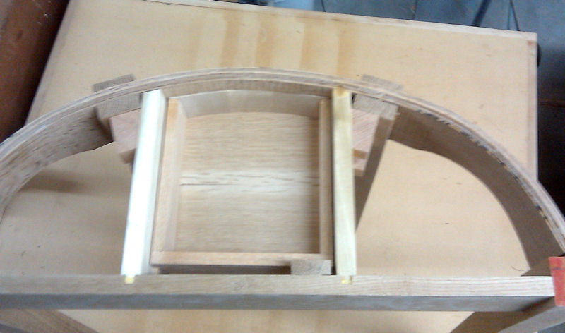 After the arches have been cut into the apron, the opening for the drawer is made with a plunge cut on a tablesaw, not for the faint-hearted.