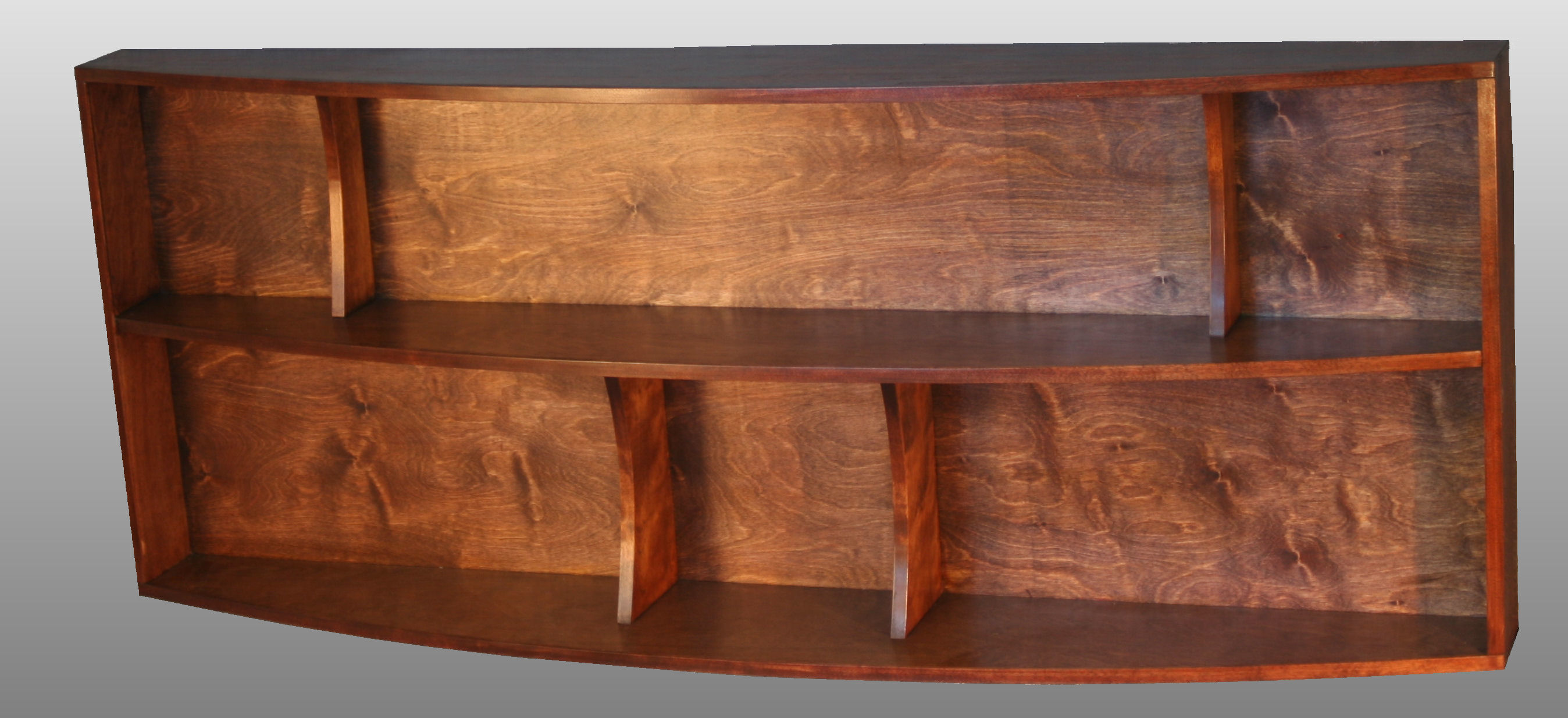 This curved bookcase was built to fit the front of a curved executive desk. This required careful color-matching and matching of the desk geometry itself. The bookcase is built of birch and color matched using dyes and stains. The finish is dyed shellac.