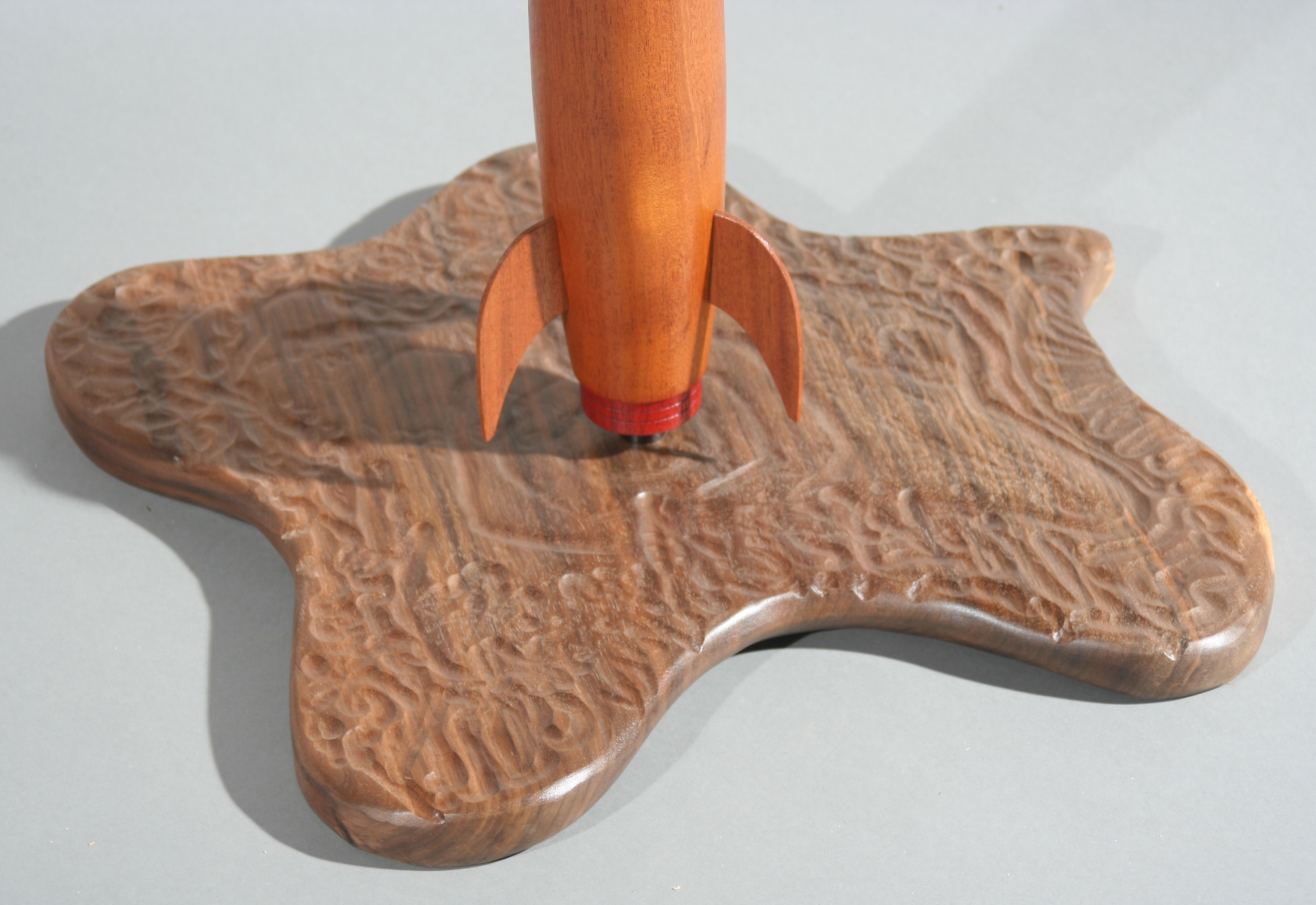 A homage to 1940s science fiction. The body of the rocket is mahogany while the base and top are walnut. Inlaid into the walnut top are the most recognizable primary stars of the Orion constellation.