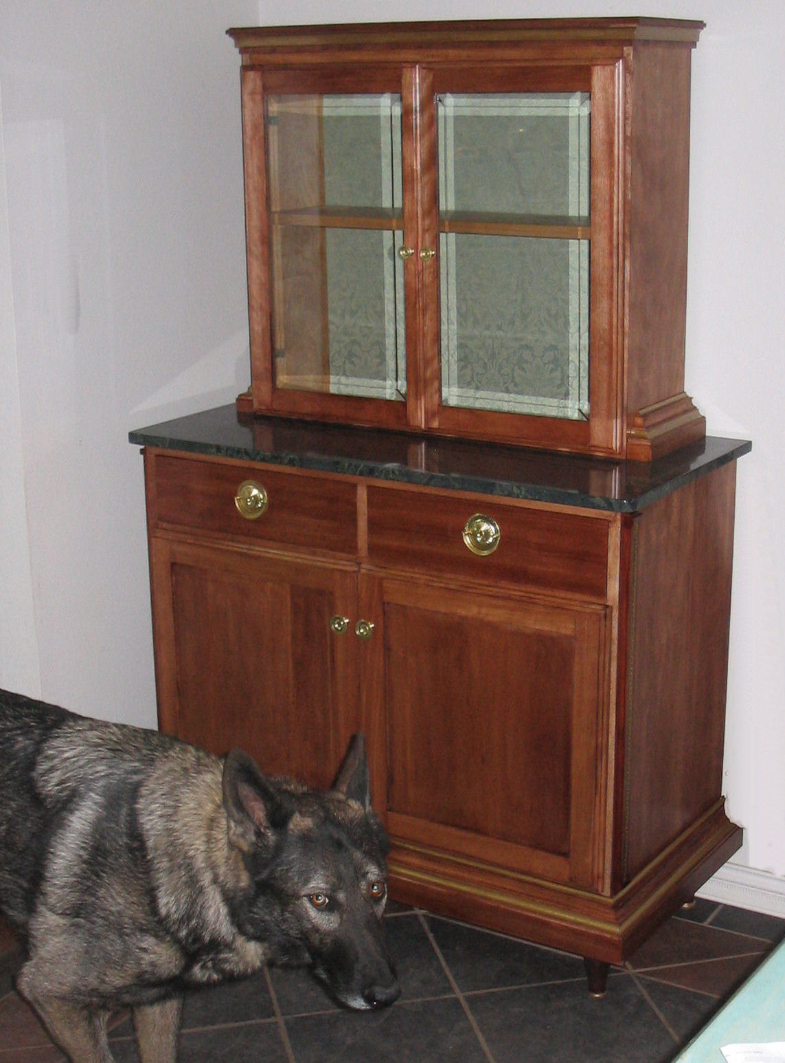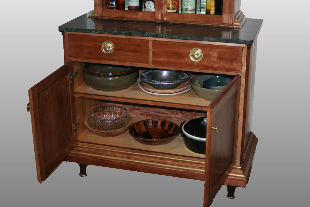 This liquor cabinet was designed to complement an existing French Empire style vitrine (glass display case) . All the trim moldings were custom made in-shop to match those of the vitrine and the feet of this piece were lathe-turned to match the feet of the vitrine and . The original vitrine has lovely beveled glass and I built these doors using glass with the same bevel. The surface of the midlevel setback is verde granite, a reference to the marble used in original empire pieces (but much easier to maintain). The cabinet is made of birch which has been dyed to deepen the color. Both the top and bottom cases are hand-dovetailed together for strength, even though this detail is mostly hidden by molding and by using half-blind dovetails. The drawers are hand-dovetailed as well.