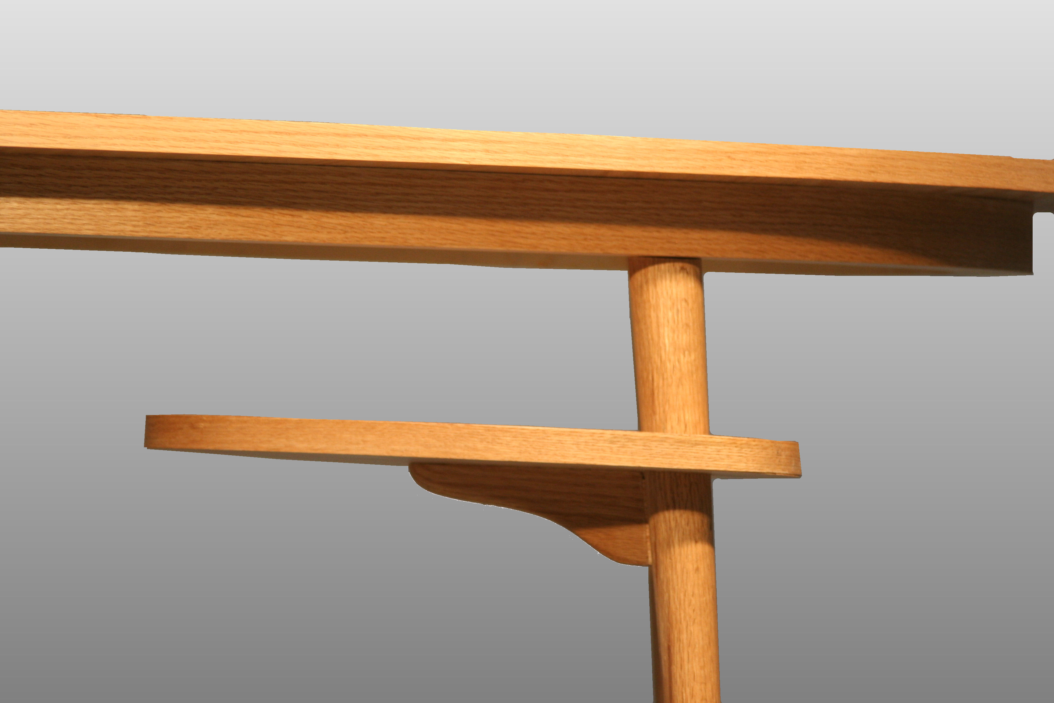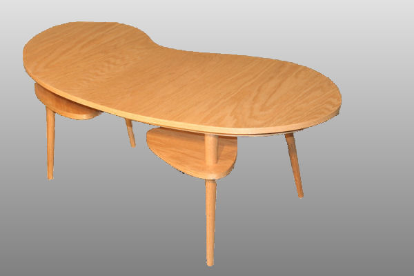 The clients wanted a coffee table to fit into their Frank Lloyd Wright style house. They provided photographs of the room, showing the strong linear lines and extensive use of oak. This table is designed to mix with the red oak woodwork in place, while the kidney shape relieves a bit of the strong linear sense of the pre-existing woodwork. The two small asymmetric leg-mounted shelves help smooth the lines as well as provide a small storage space without the dust collecting tendencies of a full lower shelf.