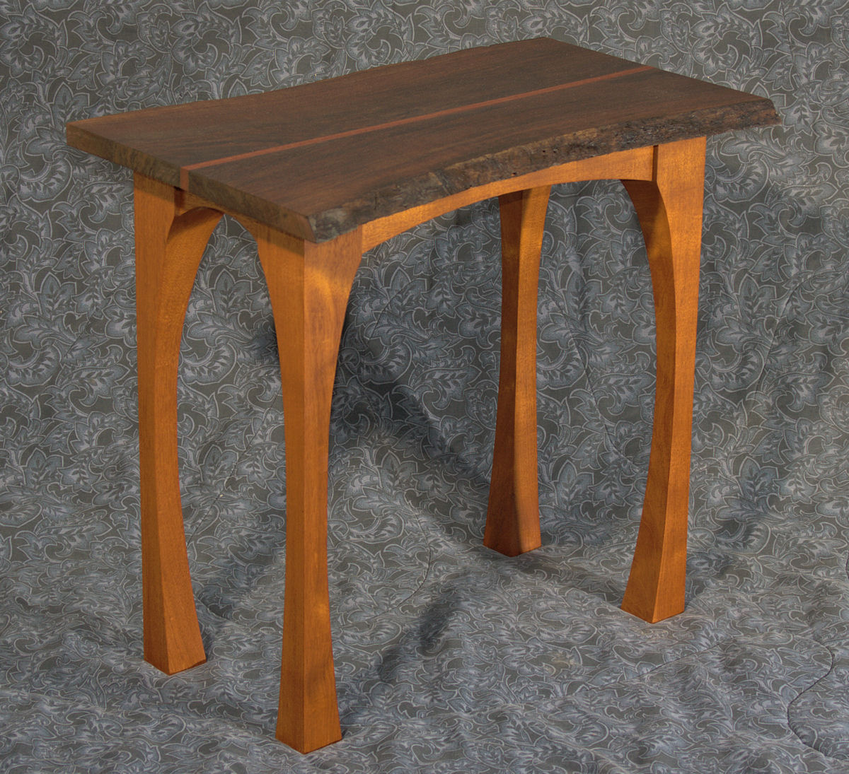This table uses a live edge walnut plank as its top. Live edge refers to the unsawn edge that reflects the actual outer surface of the tree (minus the bark in this case). This live edge helps to recall that the wood is indeed from a tree. Hopefully, it will remind the viewer to be thankful for the wildlands of nature. This wood was harvested from a walnut tree felled during the construction of a house.
